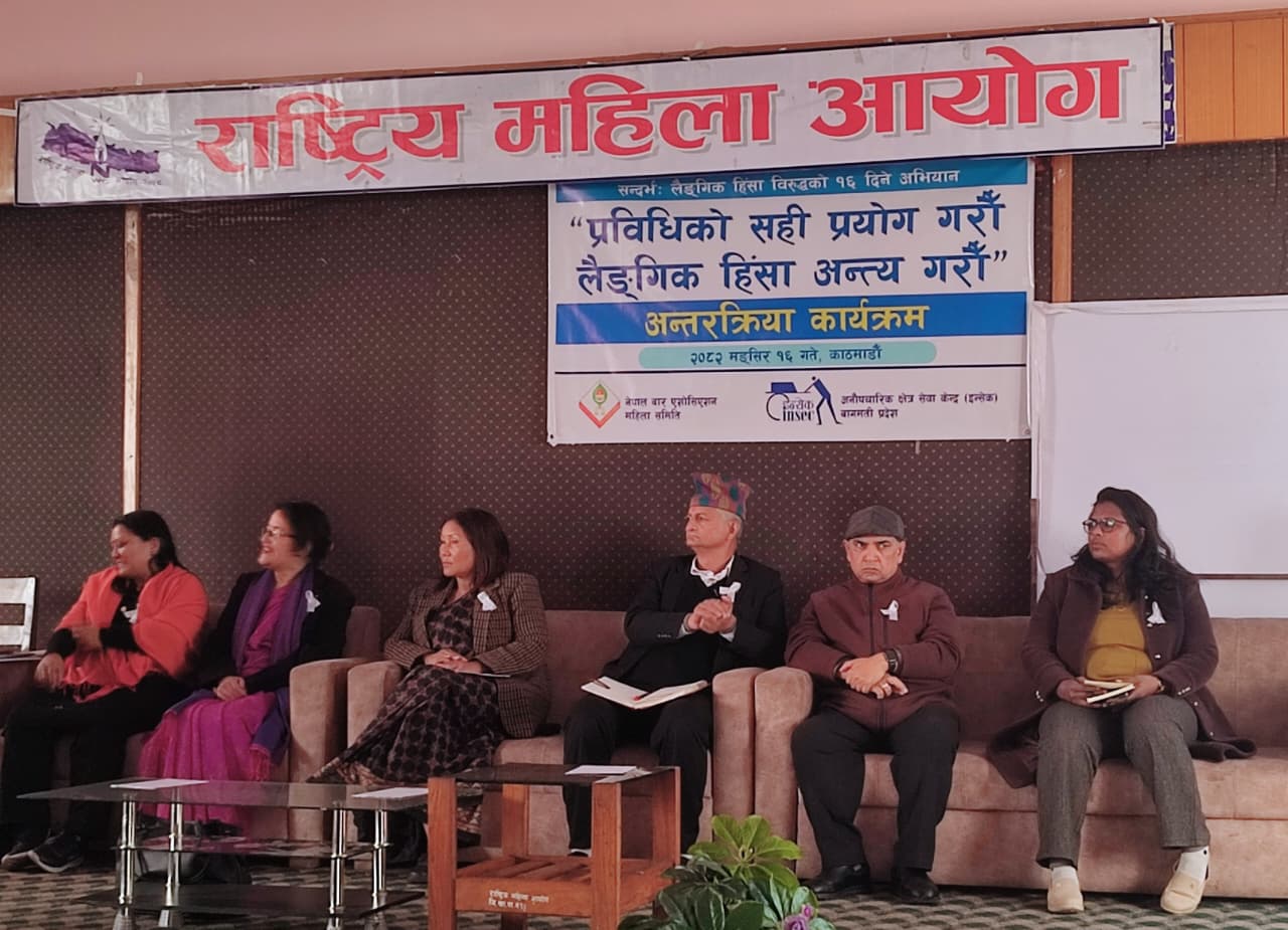 कार्यक्रम लैङ्गिक हिंसा विरुद्दको १६ दिने अभियानको सन्दर्भमा आयोजना गरिएको उपाध्यक्ष अधिवक्ता सरस्वती श्रेष्ठले जानकारी दिइन्।
