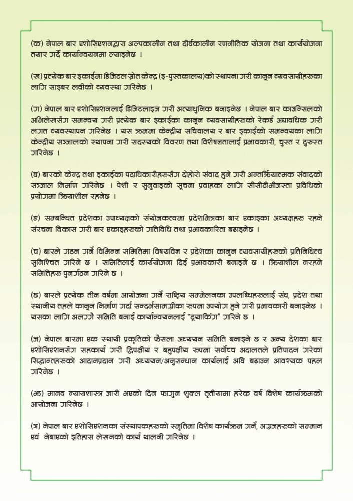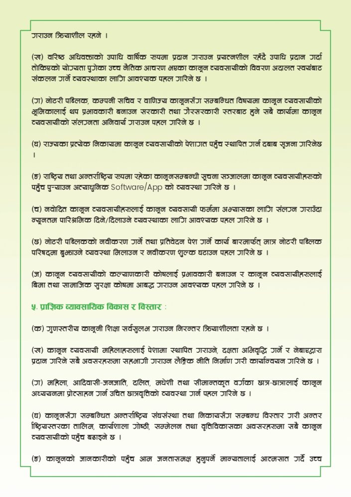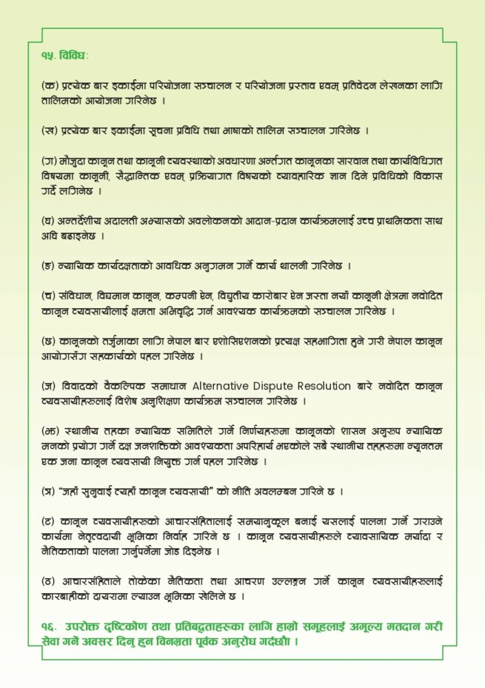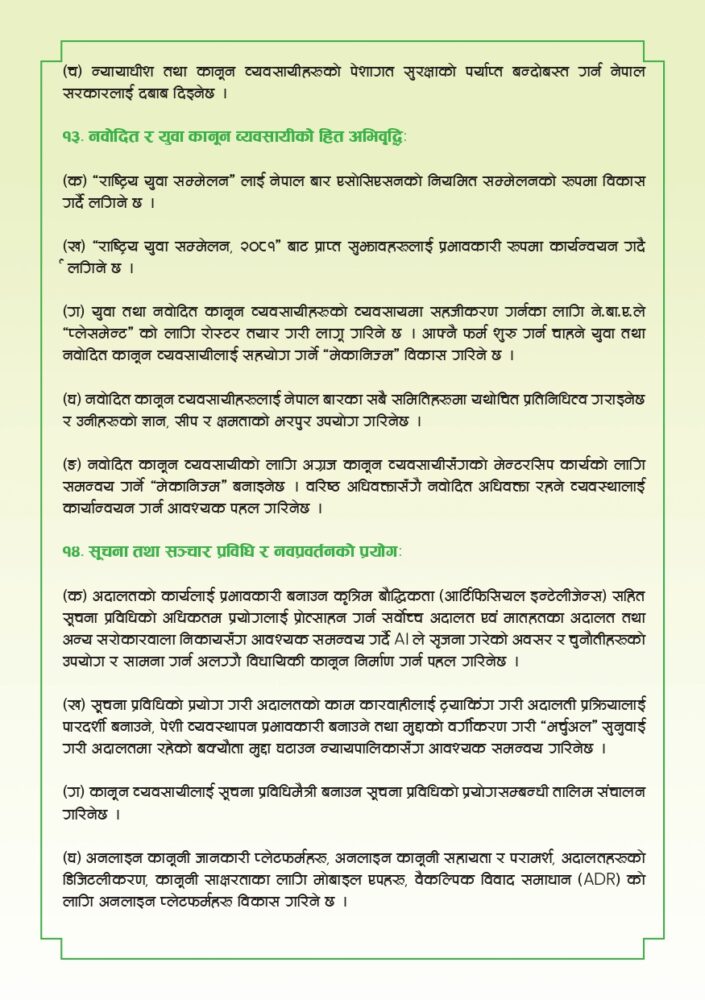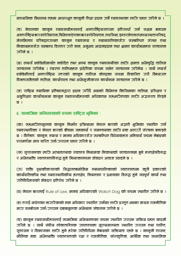 नेबाएलाई भ्रष्टाचार विरुद्ध सशक्त रुपमा उभ्याउनु पर्ने, शीघ्र लयर्स एकेडेमीको स्थापना गरी तालिम कार्यक्रम सञ्चालन गर्नुपर्ने, नेपाल बार काउन्सिलको कार्यक्रमहरु कानून व्यवसायी केन्द्रित हुनुपर्ने, नेबाएको अन्तराष्ट्रिय सम्बन्ध थप मजबुत तुल्याउन पर्ने र विशेष गरी युवा तथा कानून व्यवसायी, महिला कानून व्यवसायीको हकहितमा तुरुन्तै कदम चाल्नुपर्ने कुरामा मिश्र विश्वास राख्दछन्।