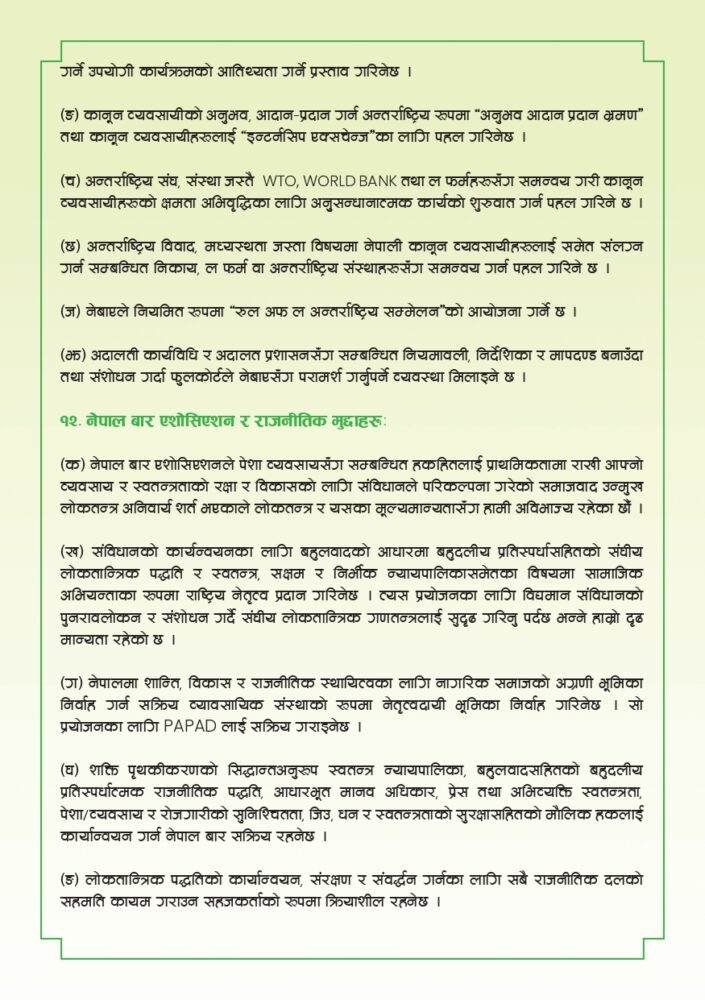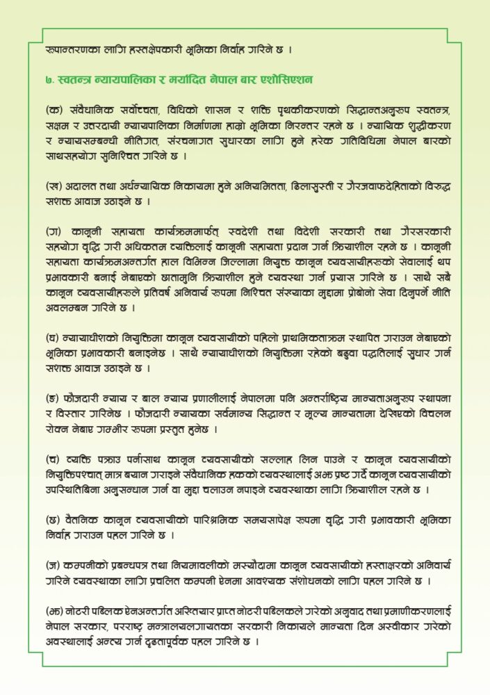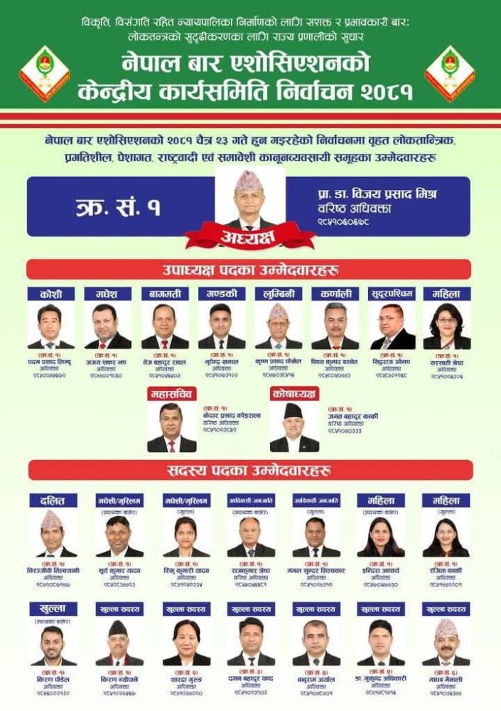 चैत्र २१, काठमाडौं।नेपाल बार एशोसियनको २७ औं केन्द्रिय कार्यसमितिको निर्वाचनको प्रचारप्रसार चलिरहेको छ। यस पटक वरिष्ठ अधिवक्ता प्रा.डा विजय कुमार मिश्रको नेतृत्वको वृहत लोकतान्त्रिक, प्रगतिशिल, पेशागत, राष्ट्रवादी एवं समाबेशी कानूनव्यवसायी समुह र वरिष्ठ अधिवक्ता रमन कुमार श्रेष्ठको नेतृत्वको व्यावसायिक कानून व्यवसायी समुह लगायत स्वतन्त्र उम्मेदवारहरु कानून व्यवासायीहरु माझ मतदान गर्न देश दौडाह सकेर काठमाण्डौं केन्द्रित भएका छन्। प्रा.डा मिश्र डिएलएको तर्फबाट उम्मेदावर रहेका छन्। यसैगरी यही समुहका महासचिवका उम्मेदवार वरिष्ठ अधिवक्ता केदार प्रसाद कोइराल पिपिएलए को नेतृत्व गर्दै यस समुहबाट चुनावी मैदानमा छन्।
